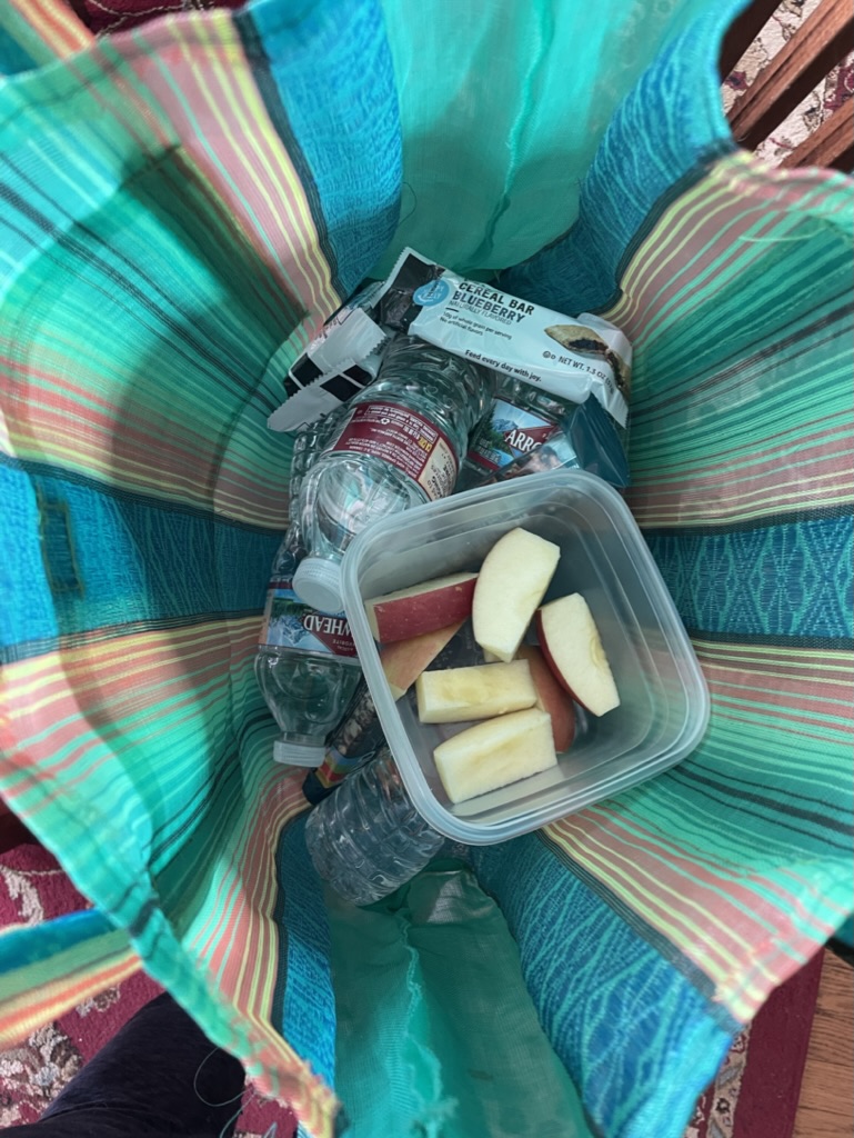 Family visits and social activities have been cancelled, and now we're in a holding pattern. This is a photo of one our "feed bags" - bottled water, apple slices, and cereal bars. We just hang the bag on the bedroom doorknob to send food in and out.