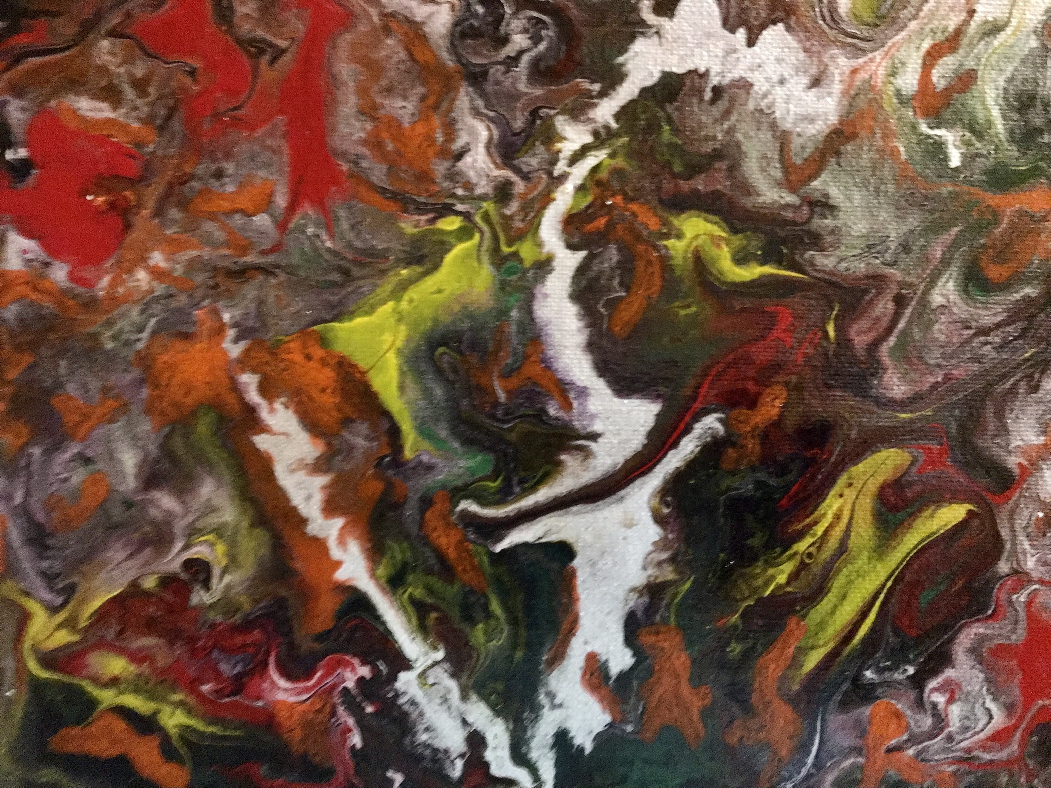The photo is of an acrylic poured painting I did at my friend’s house. Everything we went through with the pandemic still seems surreal and mixed up, like the painting.