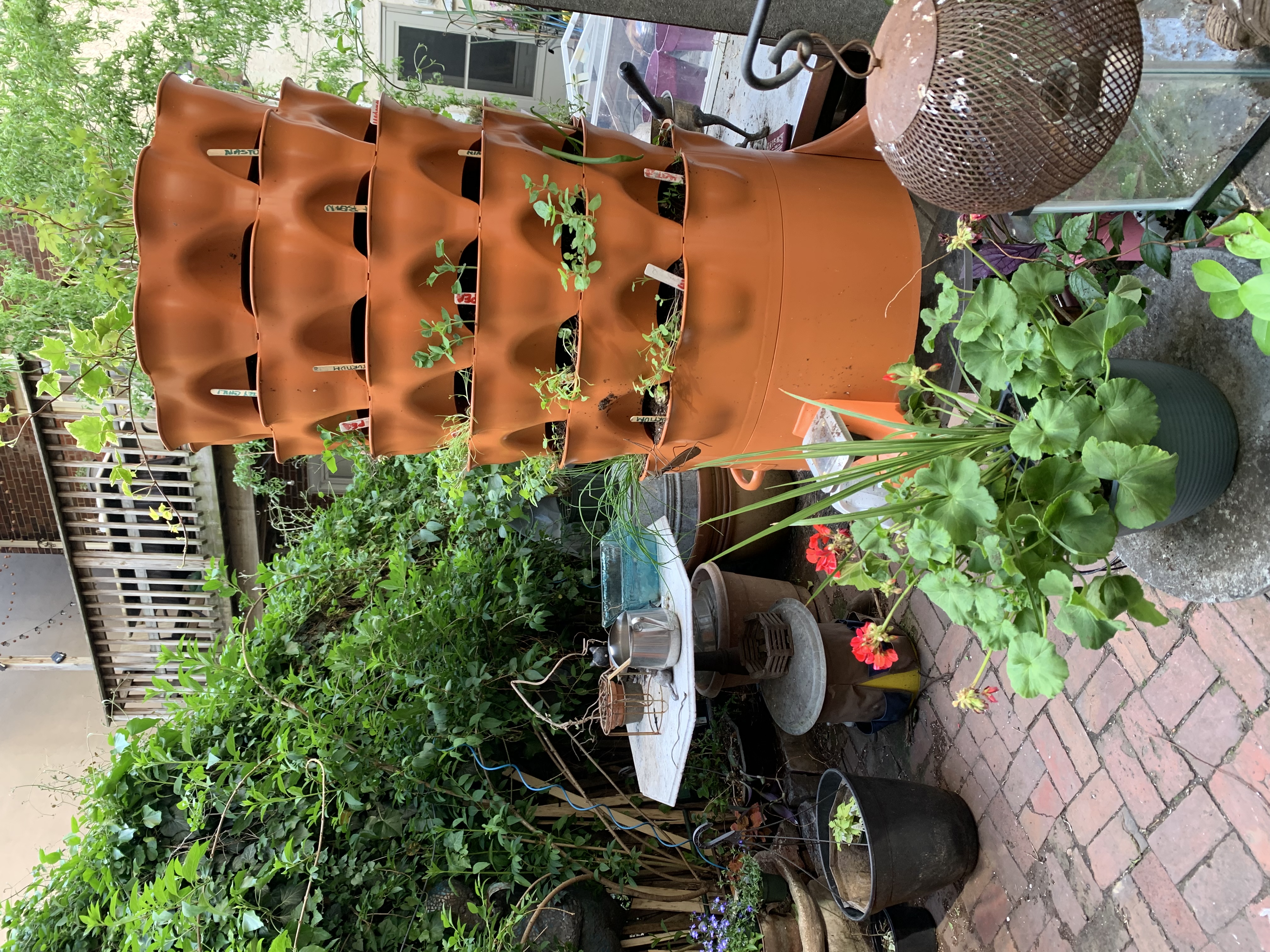This is my current project. I purchased this Garden Tower as a Christmas gift for myself and have waited months for the weather to allow me to start plants by seed. I was looking at consolidating my garden and not thinking about composting in it when I purchased it. Now I’m excited to trim my vegetables and add to the compost so my worms have food to make compost tea, which gives my plants nutrients. This has been great so far . I’m eating more vegetables, growing future vegetables as well as herbs and flowers & enjoying watching things leaf out. I bought a 2nd tower and spent time setting it up and transplanting basil and poppies into it today. I planted some seeds, too.